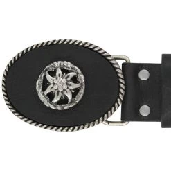 Cette boucle ovale de AMMANN très élégante a une fine bordure décorative en métal, une zone intérieure en cuir et un edelweiss en métal avec 5 cristaux autrichiens au milieu. La boucle mesure 3 1/4 pouces de long et 2 1/2 pouces de large.